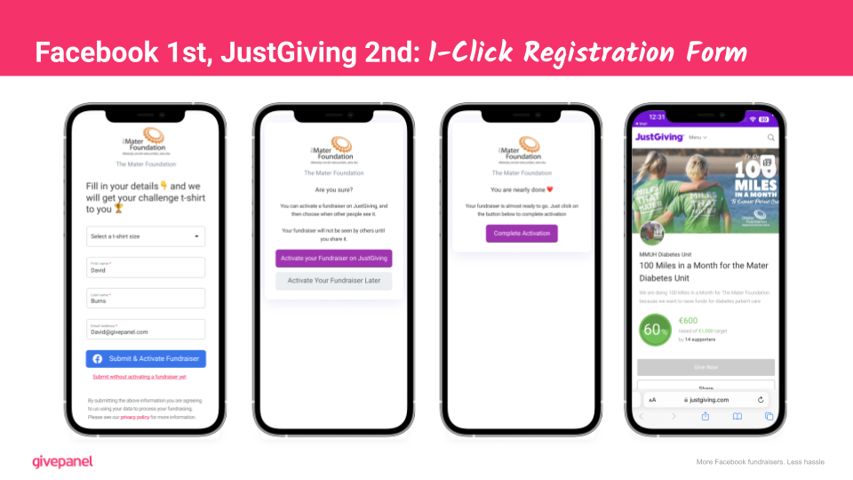 As well as the three journey options for supporters, the 1-Click JustGiving experience for Facebook Challenges also includes a host of new capabilities within the GivePanel platform.